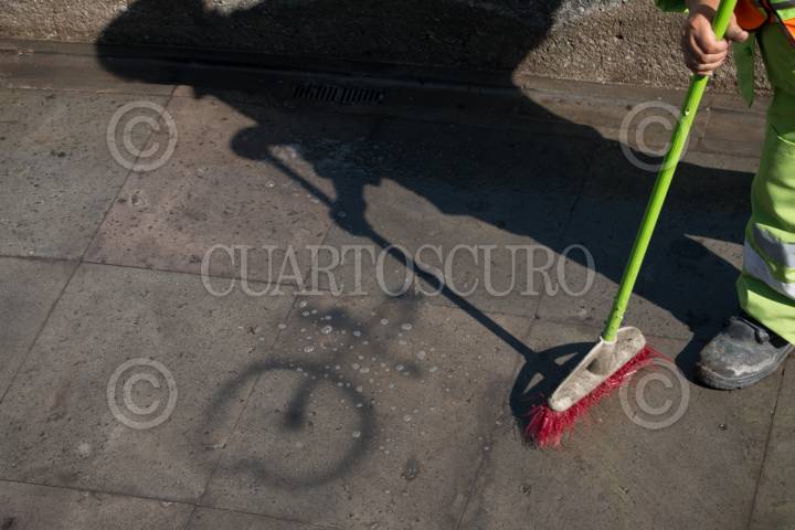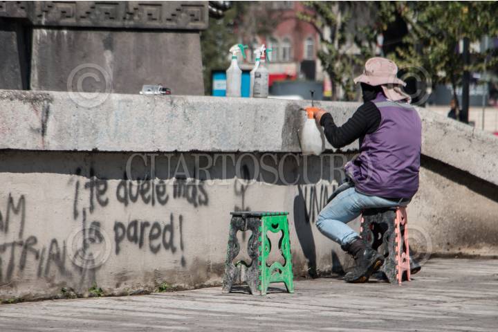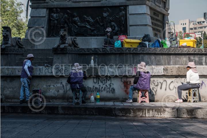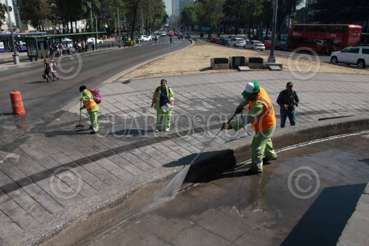 Trabajadores de limpieza en coordinación con la dirección general de Sitios y Monumentos del Patrimonio Cultural, trabajan en los últimos detalles del mantenimiento y restauración del Monumento a Cuauhtémoc