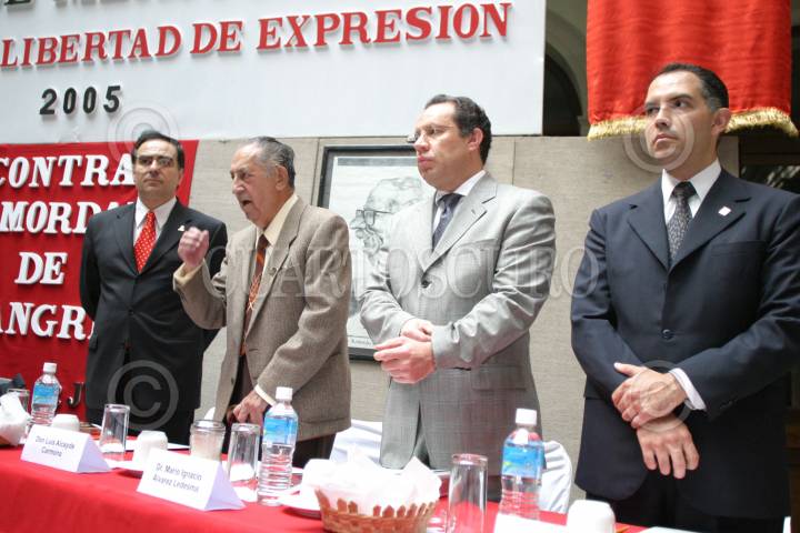 MEXICO D.F. 02JUNIO2005. El integrante del club de periodistas Mouris Salloum, el presidentre vitalicio del club de periodistas Luis Alcayde, el subprocurador de derechos humanos de la PGR Ignacio Alvarez Ledezma y Julio Di Bella director del Canal 11 ayer durante el foro " Contra la mordaza de la sangre" organizado por el club de periodistas. FOTO: Miguel Dimayuga/CUARTOSCURO.COM