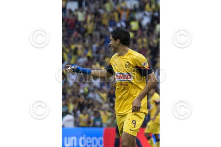 MÉXICO, D.F., 17NOVIEMBRE2012.- Raul Jimenez de las Águilas del América festeja su anotación en contra del Monarcas Morelia, encuentro de octavos de final del Torneo Apertura 2012 que se realizó en el estadio Azteca; encuentro que ganaron las Águilas en marcador global 3 goles a 2. FOTO: RODOLFO ANGULO /CUARTOSCURO.COM