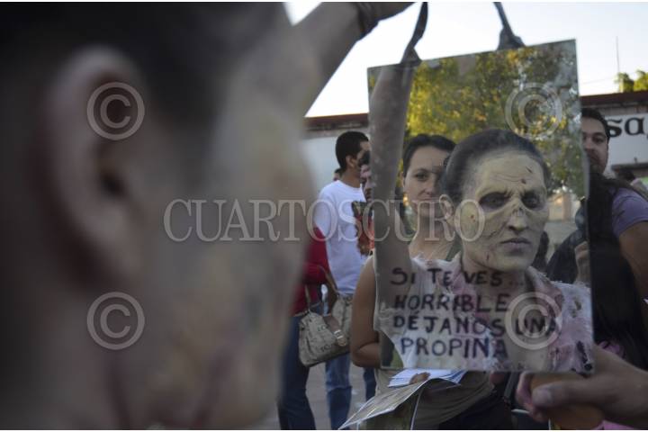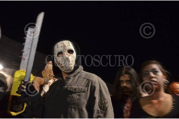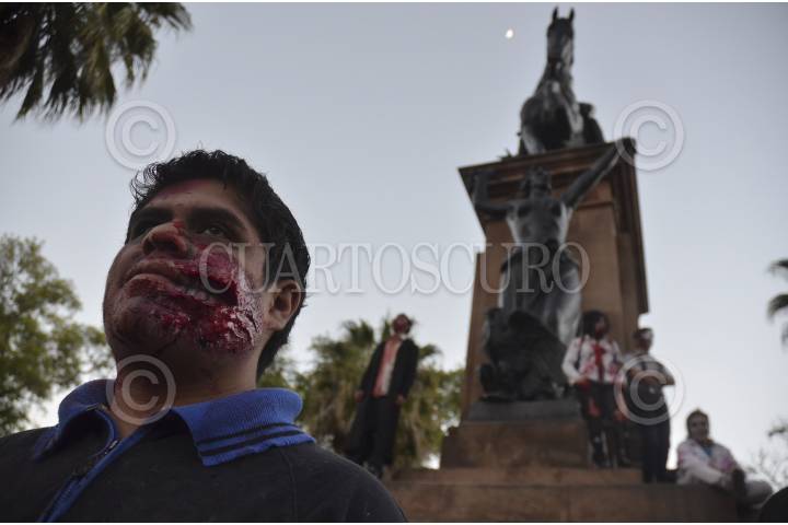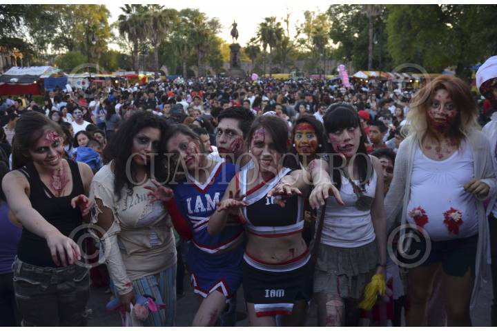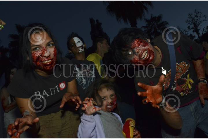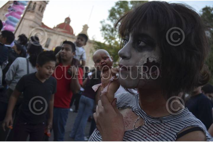 MORELIA, MICHOACÁN, 19NOVIEMBRE2012.- Más de 500 Zombies caminaron por dos de las principales avenidas de Acueducto y Madero. Esta caminata fue organizada por el municipio de Morelia y por un grupo de jóvenes que se hacen llamar Zombie Walk Morelia, que pedía un kilo de arroz o frijoles para una buena causa. Al finalizar se proyectaron cortos de Zombies en la plaza San Francisco. FOTO: ALAN ORTEGA /CUARTOSCURO.COM