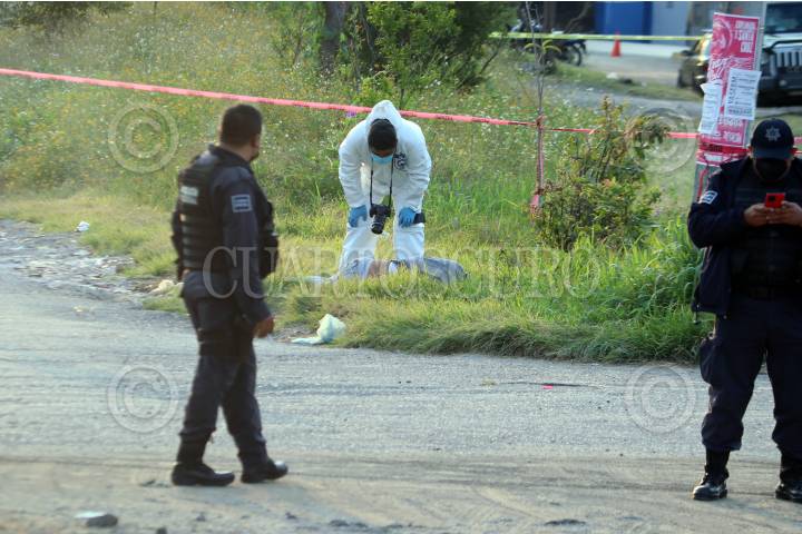 Un perito en fotografía de la Fiscalía de Morelos observa el cadáver de un hombre que fue localizado al amanecer al norte de la capital.