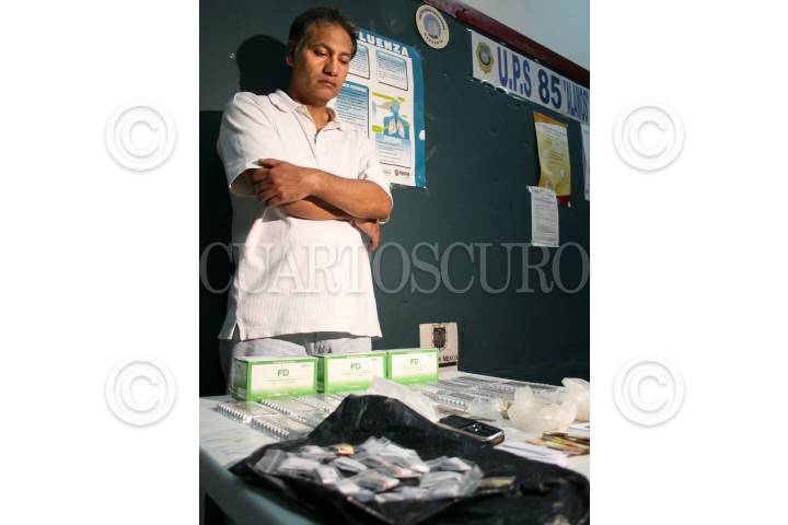 MÉXICO, D.F., 10JULIO2009.- Enrique Camacho Davalos de 41 años, presunto distribuidor de droga que operaba en la colonia Narvarte en bares y cantinas, fue capturado por policias preventivos al ir a bordo de su automóvil sobre avenida Dr. Vertiz, a este sujeto se le encontraron mas de 200 dosis de cocaina, un centenar de pastillas psicotropicas, 2 bolsas de marihuana y 150 ampolletas de lidocaína HCL, esta ultima sustancia funciona como anestesia médica y el detenido confeso que la revolvería con la cocaína para provocar un efecto mayor en el consumidor, cabe señalar que este medicamento en consumo no moderado puede ocasionar la muerte. FOTO: LUZ ACEVEDO/CUARTOSCURO.COM