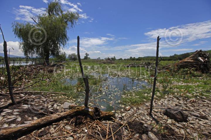 JUANACATLAN, JALISCO.17JULIO2024.- La mortandad de miles de peces de la especie tilapia en las inmediaciones del Rio Santiago a un costado de la ex Hacienda Zapotlanejo, fue un hecho que se genero desde ya días pasados, las causas se desconocen ya que existen algunas hipótesis, pero ninguna confirmada, al lugar acudió personal del Sistema Intermunicipal de los Servicios de Agua Potable y Alcantarillado (SIAPA), para minimizar los olores fétidos colocando cal. FOTO: FERNANDO CARRANZA GARCIA / CUARTOSCURO.COM