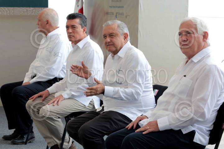 Rutilio Escandón Cadenas, Andrés Manuel López Obrador, y Víctor Manuel Villalobos Arámbula, durante la inauguración de la planta de cría y esterilización de machos de la mosca del Mediterráneo.
