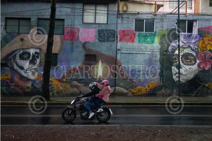 CIUDAD DE MÉXICO, 06AGOSTO2025.- En la ciudad de México cada semana mueren cerca de 5 motociclistas en accidentes viales, esto según datos de la Secretaría de Movilidad (Semovi) en su último Reporte Trimestral de Hechos de Tránsito del año pasado. En imagen aspectos de motociclistas frente a un mural alusivo a la celebración de Día de Muertos. FOTO: ROGELIO MORALES /CUARTOSCURO.COM