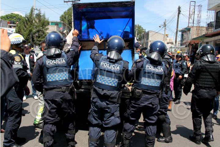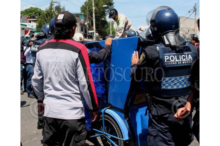 CIUDAD DE MÉXICO, 03AGOSTO2017.- Elementos de la Policía de Seguridad Pública de la Ciudad de México montaron un operativo para incautar mototaxis y bicitaxis, lo que provocó un enfrentamiento con pobladores de San Gregorio Atlapulco, delegación Xochimilco, se detuvo a cinco personas. FOTO: ARMANDO MONROY /CUARTOSCURO.COM