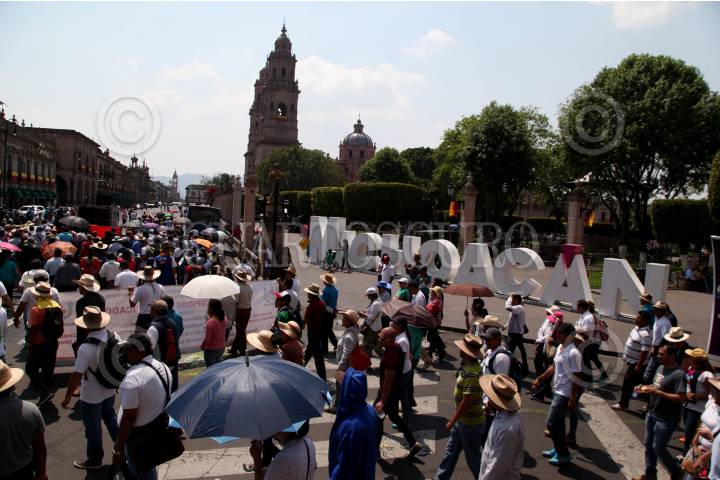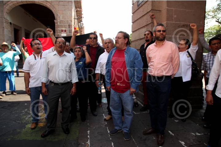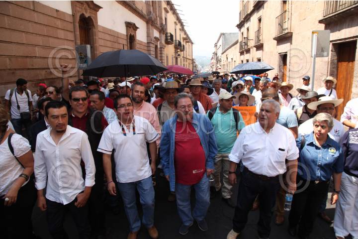 MORELIA, MICHOACÁN, 23MAYO2016.- En la capital michoacana, miles de integrantes de la Sección 18 de la CNTE marcharon para sumarse a la movilización nacional en la que se denunció el desalojo a docentes el pasado fin de semana que se encontraban en la Plaza de Santo Domingo. Durante la manifestación Paco Ignacio Taibo Segundo, quién se encontraba en la ciudad se adhirió a dicha marcha incluso arribando al templete, desde dónde exclamó un fuerte discurso en apoyo a los profesores y en contra de la Reforma Educativa. FOTO: ALAN ORTEGA /CUARTOSCURO.COM