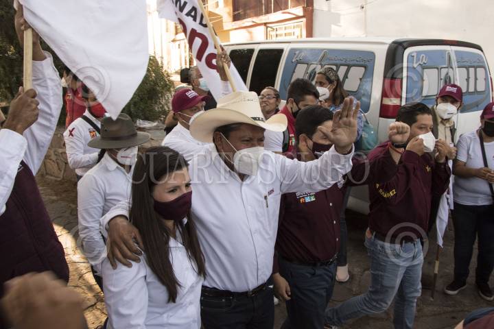 David Monreal, candidato a la gubernatura por Morena, es acompañado por Gabriela Pinedo, candidata a diputada federal y Jorge Miranda, a la presidencia municipal de Zacatecas.