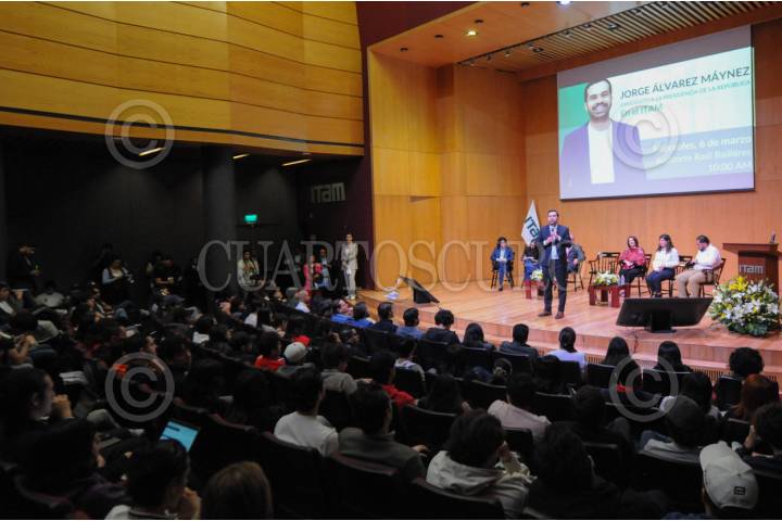 CIUDAD DE MÉXICO, 06MARZO2024.- Estudiantes del ITAM escuchan la participación de Jorge Álvarez Maynez, candidato de MC a la presidencia. FOTO: DANIEL AUGUSTO /CUARTOSCURO.COM