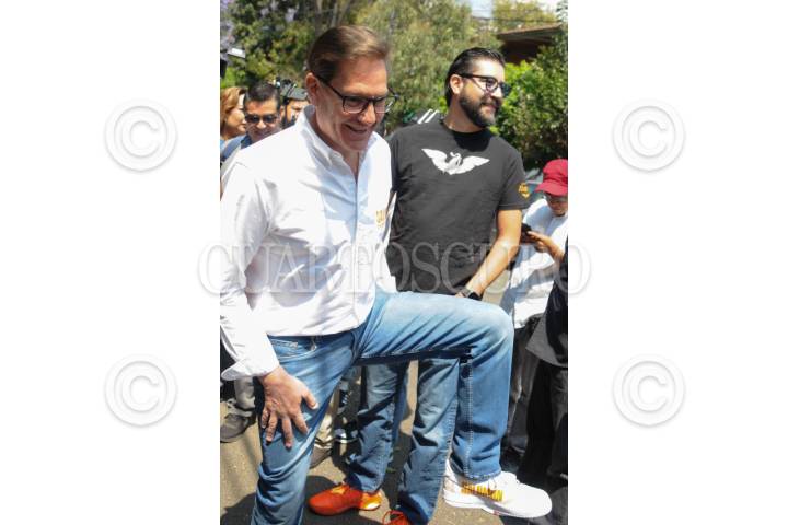 CIUDAD DE MÉXICO, 28MARZO2024.- Salomón Chertorivski, candidato a jefe de gobierno por MC, muestra sus tenis los cuales llevan su nombre. FOTO: DANIEL AUGUSTO /CUARTOSCURO.COM