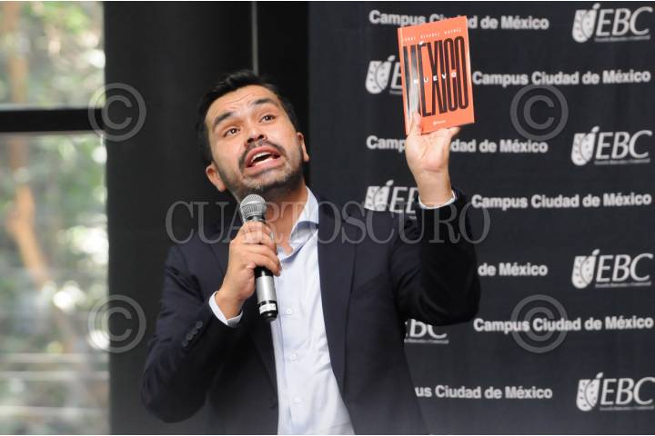 CIUDAD DE MÉXICO, 08MAYO2024. - Con su libro "México Nuevo" en las manos, Jorge Álvarez Maynez, candidato presidencial de Movimiento Ciudadano, dialoga con los estudiantes de la EBC. FOTO: DANIEL AUGUSTO /CUARTOSCURO.COM