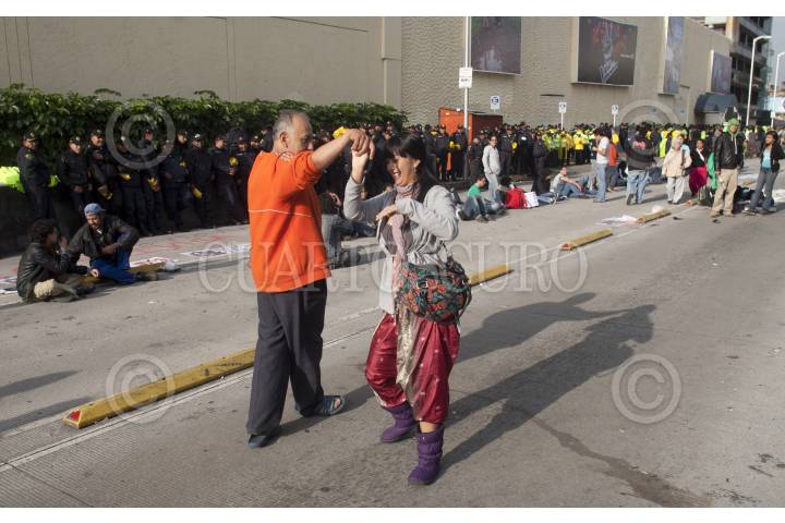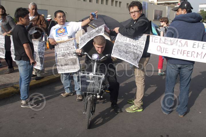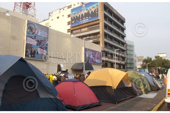 MÉXICO D.F., 26JULIO2012.- Integrantes del Movimiento #yosoy132 y miembros del Sindicato Mexicano de Electricistas entre otros, acamparon la noche de ayer en las inmediaciones de Televisa, esto en protesta por lo que consideran ellos el apoyo de la televisora a Enrique Peña Nieto en los pasados comicios presidenciales del 1 de Julio. El inmueble se encuentra custodiado por decenas de uniformados de la Secretaria de Seguridad Pública. FOTO: FRANCISCO RODRÍGUEZ /CUARTOSCURO.COM