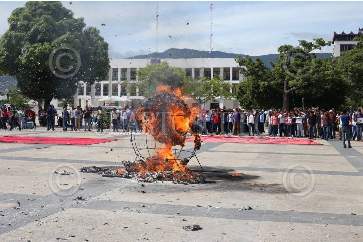 TUXTLA GUTIÉRREZ, CHIAPAS, 06AGOSTO2018.- Estudiantes de la Escuela Normal Rural Mactumatzá, marcharon en la capital chiapaneca para recordar la represión que sufrieron hace 15 años por parte del gobierno del estado. Al final del mitin político prendieron fuego a un monigote que representa la imagen del ex gobernador de Chiapas durante el período 2000-2006 Pablo Salazar Mendiguchía. Fue puesto al centro de la Plaza Central donde fue exhibido al público. FOTO: JACOB GARCÍA / CUARTOSCURO.COM