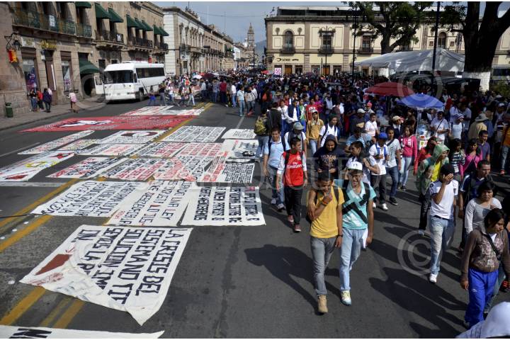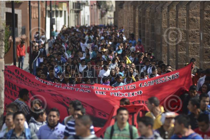 MORELIA, MICHOACÁN, 15OCTUBRE2013.- Más de 2 mil alumnos de las diferentes escuelas normales del estado marcharon en la capital del estado por las principales avenidas. Los estudiantes se trasladaron en más de 37 autobuses que fueron retenidos en días pasados por la normal de Tiripetío y Cherán. FOTO: ALÁN ORTEGA /CUARTOSCURO.COM