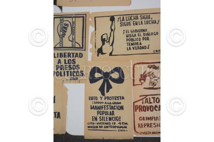 Se desplegó una manta sobre la explanada de la Plaza de las Tres Culturas donde se manifiestan en contra de la militarización del país.
