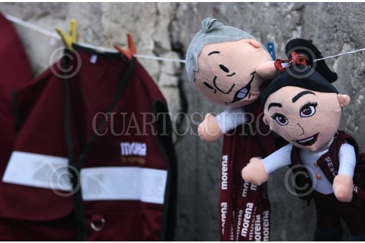 TEMIXCO, MORELOS, 03DICIEMBRE2023.- Figuras de tela del presidente Andrés Manuel López Obrador y de Claudia Sheinbaum, precandidata a Coordinadora Nacional de la Cuarta Transformación en un puesto de venta fuera de un mitin del Movimiento de Regeneración Nacional. FOTO: MARGARITO PÉREZ RETANA/CUARTOSCURO.COM