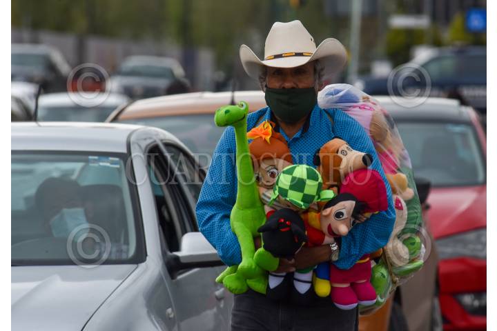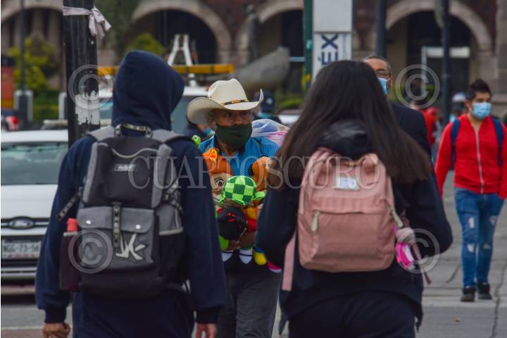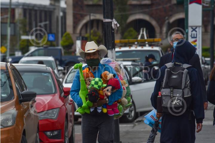 Un hombre de la tercera edad recorre la capital mexiquense vendiendo muñecos de peluche.