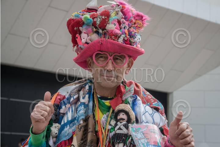 Un hombre que porta una gran variedad de muñecos de peluche posa para una fotografía mientras camina por el Complejo Cultural Los Pinos.
