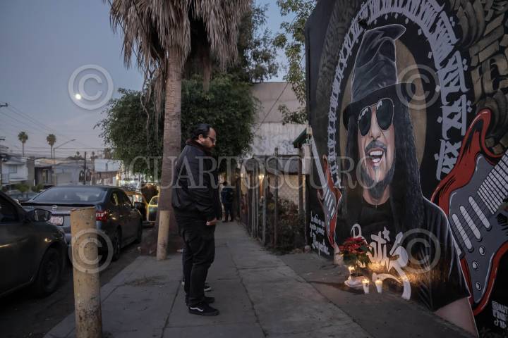 TIJUANA, BAJA CALIFORNIA, 11DIC2024.- “Desgraciadamente se fue hoy, en sus sueños, bendito sea Dios, me dejó, nos dejó, es una pérdida muy grande para mí, para mi hija para México, para Tijuana ”, expresa Claudia Bátiz, esposa del guitarrista. La ciudad de Tijuana está de luto este sábado 14 de noviembre, tras el fallecimiento del reconocido guitarrista Javier Bátiz, a la edad de 80 años. El músico había recibido las llaves de la ciudad apenas dos semanas antes, en reconocimiento a su trayectoria artística. Según, Claudia Bátiz, el guitarrista había estado enfermo durante algún tiempo, padeciendo cáncer de próstata, un tumor cerebral y múltiples impactos cerebrales, además de una condición conocida como Leucoaraiosis. A principios de este año, Bátiz había sido hospitalizado en varias ocasiones debido a la gravedad de sus enfermedades. Claudia Bátiz, agradeció a los fans por el apoyo y cariño que siempre habían mostrado hacia el músico. "Siento mucha tristeza, pero tranquila, ya que se fue en paz, con el amor de su familia", expresó con un nudo en la garganta. La esposa del guitarrista, aseguró también que el último deseo de Bátiz era ser enterrado en el panteón Monte de los Olivos, junto a sus padres, y que así se haría. “Ahora si se convierte en una leyenda completa” afirmó. El concierto a beneficio del guitarrista, programado para el día siguiente en el Cecut, seguirá adelante, pero ahora se convertirá en un homenaje a la vida y legado de Javier Bátiz. Entre flores y veladoras, amigos y familiares de Javier Bátiz, llegaron a la casa del músico donde se encontraba su esposa para despedirlo justo en el mural que habían inaugurado el pasado 24 de noviembre. Los presentes se quedaron hasta que el cuerpo de Bátiz fue subido llevado por la funeraria. FOTO: OMAR MARTÍNEZ/ CUARTOSCURO.COM