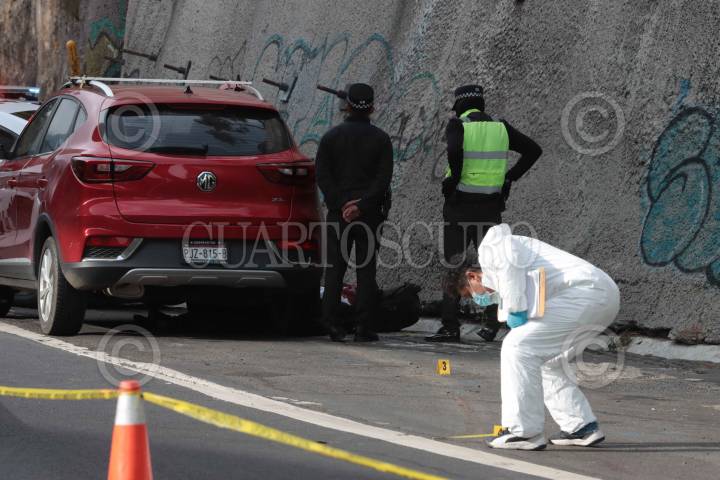 ESTADO DE MÉXICO, 15DICIEMBRE2023.- Un motociclista falleció luego de un percance vehicular en la lateral de la autopista México-Toluca. FOTO: ROGELIO MORALES/CUARTOSCURO.COM