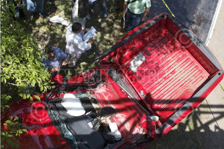 VILLAHERMOSA, TABASCO, 30MAYO2012.- Un joven perdió la vida cuando se impacto a bordo de su camioneta tipo pick ups contra un poste de concreto que sostiene un puente peatonal al ir huyendo de sus secuestradores. Los hechos acontecieron sobre el bulevar Adolfo Ruiz Cortinez de la colonia Tabasco Dos Mil, donde autoridades policiacas acordonas el área. FOTO: MARCO POLO GUZMÁN HERNÁNDEZ /CUARTOSCURO.COM