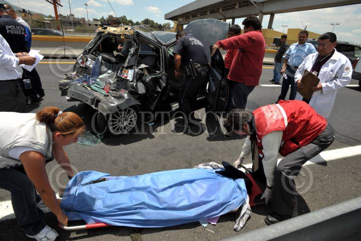 MÉXICO, D.F., 28JUNIO2010.- Una mujer de 75 años aproximadamente, pierdio la vida al ser impactado el auto Seat Ibiza de color negro con placas 573RFW en que viajaba por un autobús de la línea Futura con placas 869-HS-6 en el Kilómetro 1 de la autopista México Pachuca perímetro del Municipio de Ecatepec. Una persona fue trasladada grave al Hospital regional de la zona. FOTO: LUIS CARBAYO/CUARTOSCURO.COM