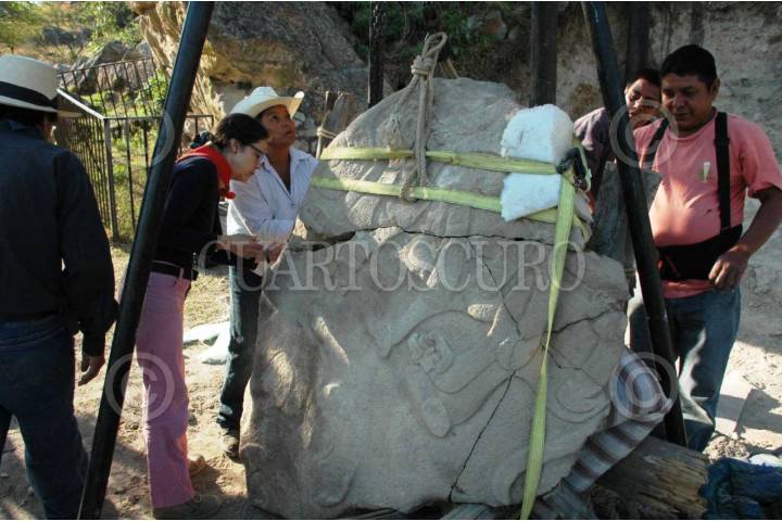 JANTETELCO, MORELOS, 25JULIO2011.- El antiguo monumento, que arqueólogos han denominado Tríada de los felinos, fue hallado en la Zona Arqueológica de Chalcatzingo, en el estado de Morelos. Un relieve olmeca de más de una tonelada y media, con la imagen de tres felinos, y cuya antigüedad es de aproximadamente dos mil 800 años, representa el último monumento descubierto en Chalcatzingo, en el municipio morelense de Jantetelco, el único sitio prehispánico que se conoce en el Centro de México con grandes bajorrelieves. FOTO: INAH/CUARTOSCURO.COM