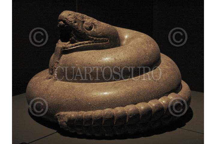 MÉXICO D.F., 18FEBRERO2008.- A partir del 28 de febrero abre sus puertas la muestra temporal llamada "Isis y la Serpiente Emplumada". En la imagen Serpiente de cascabel, diarira tallada y pulida. FOTO: MAURICIO MARAT/CUARTOSCURO.COM