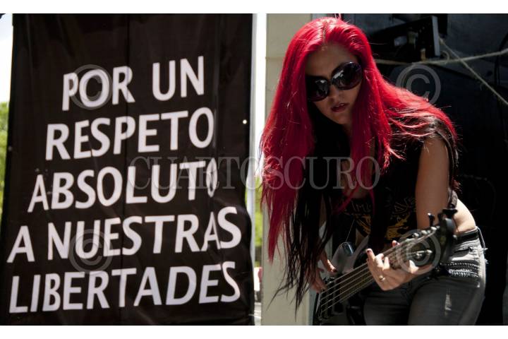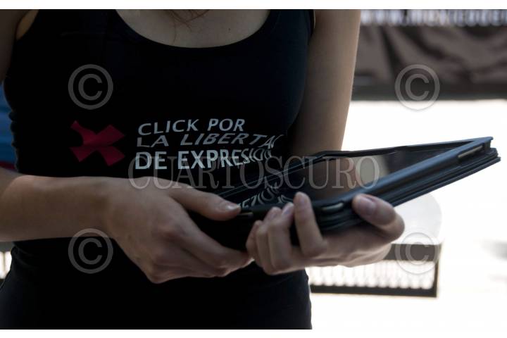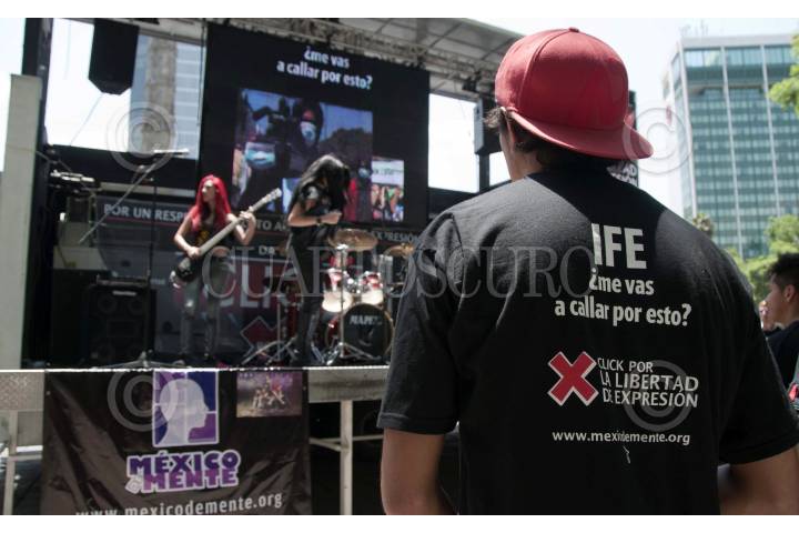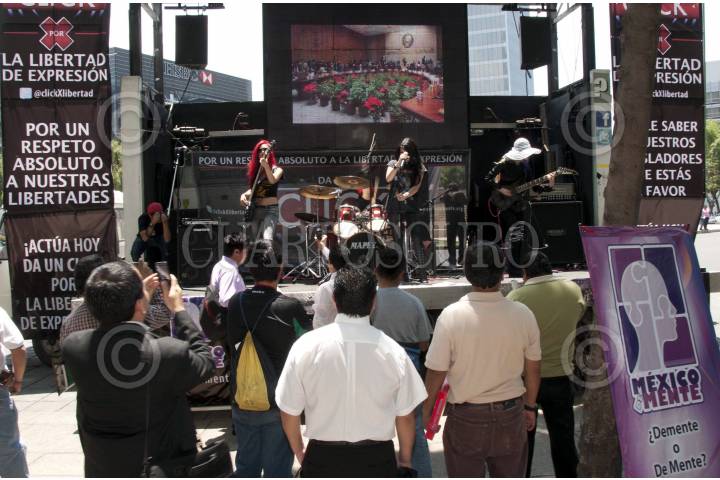 MÉXICO, D.F., 14JUNIO2012.- Con una tocada del grupo de rock ‘Mystica Girls’, la organización ‘México de Mente’ llevo a cabo una protesta en el Ángel de la independencia, donde demandaron al Instituto Federal Electoral (IFE) el respeto absoluto a la libertad de expresión. Varios jóvenes salieron con computadora en mano a invitar a los ciudadanos a dar un ‘click por la libertad de expresión’. FOTO: PATRICIA JUÁREZ /CUARTOSCURO.COM