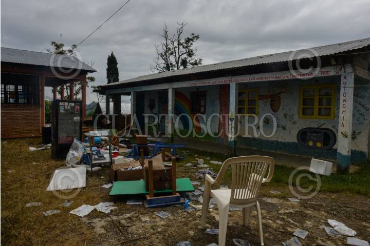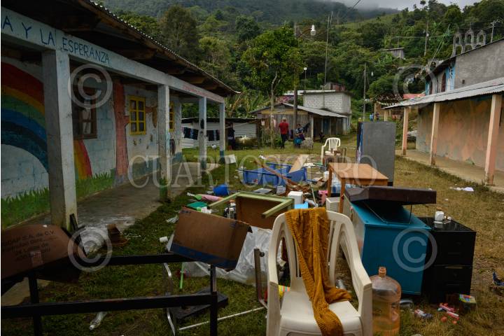ACTEAL, CHIAPAS, 21SEPTIEMBRE2019.- El campamento de la organización Las Abejas de Acteal fue allanado y algunos puntos destruidos por las hermanas Vázquez Pérez, hijas De Francisco Vázquez, quien fuera integrante de la organización hasta antes de su muerte, Las Abejas, han ocupado este espacio desde hace más de 20 años y ahora el espacio es reclamado por las hijas del fallecido. El campamento alberga hoy a las 36 personas desplazadas de la comunidad de Los Chorros, las familias se unieron hace unos días en el campamento, después de verse forzadas a separarse y abandonar sus hogares. La casa de Doña Juana fue destruida y sus cosas botadas a la intemperie, ella perdió a su marido, el fue masacrado el 22 de diciembre de 1997 en Acteal, desde entonces ella vivía en esa casa, la clínica de salud fue desmantelada, durante las agresiones las personas que estaban en el campamento solo observaron los hechos y ahora de acuerdo a sus declaraciones, buscan el dialogo con las hijas de su compañero. FOTO: ISABEL MATEOS /CUARTOSCURO.COM