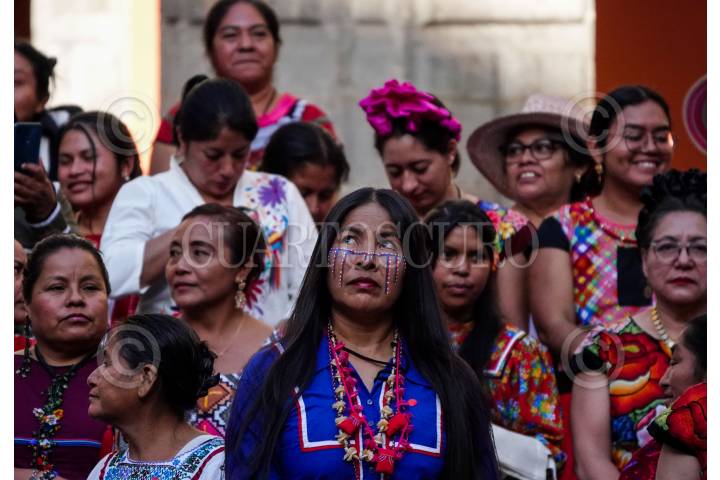 CIUDAD DE MÉXICO, 13NOVIEMBRE2024.- Una mujer Seri se muestra durante el anuncio de Original Encuentro de Arte Textil Mexicano en el patio central del Palacio Nacional. FOTO: GALO CAÑAS/CUARTOSCURO.COM
