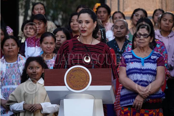 CIUDAD DE MÉXICO, 13NOVIEMBRE2024.- Claudia Curiel de Icaza, secretaria de Cultura Federal; Valentina Torres, artesana Seri, y Claudia Sheinbaum, presidenta de México, durante el anuncio de Original Encuentro de Arte Textil Mexicano en el patio central del Palacio Nacional. FOTO: GALO CAÑAS/CUARTOSCURO.COM