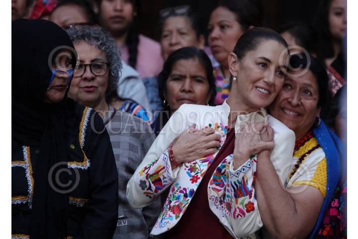 CIUDAD DE MÉXICO, 13NOVIEMBRE2024.- Una mujer artesana abraza a Claudia Sheinbaum, presidenta de México, durante el anuncio de Original Encuentro de Arte Textil Mexicano en el patio central del Palacio Nacional. FOTO: GALO CAÑAS/CUARTOSCURO.COM
