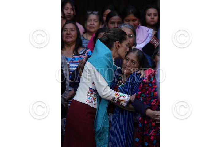 XOCHISTLAHUACA, GUERRERO, 24AGOSTO2025.- Claudia Shienbaum Pardo, Presidenta de México, y Evelyn Salgado, gobernadora de Guerrero, encabezaron una asamblea con mujeres artesanas de Xochistlahuaca. Las anfitrionas recibieron a la mandataria con una limpia para fortalecerla. FOTO: PRESIDENCIA/CUARTOSCURO.COM