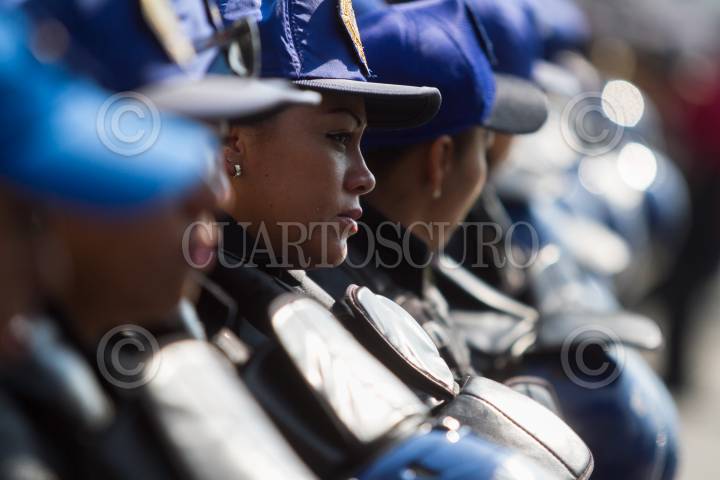 CIUDAD DE MÉXICO, 28FEBRERO2018.- Mujer policía vigila una protesta en las oficinas del Sistema de Administración Tributaria (SAT). FOTO: MOISÉS PABLO /CUARTOSCURO.COM