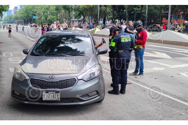 CIUDAD DE MÉXICO, 18AGOSTO2024.- Un automóvil con placas de la capital invadió la ruta del paseo dominical Muévete en Bici, policías de tránsito lo detuvieron en las inmediaciones del Ángel de la Independencia, el sujeto se retiró del lugar luego de mostrarles su celular a los oficiales. FOTO: DANIEL AUGUSTO/ CUARTOSCURO.COM