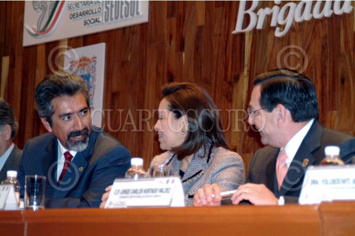 MEXICO, D. F. 09DICIEMBRE2004.- Enrique Villa Rivera, director general del Instituto Politécnico Nacional; Josefina Vázquez Mota, Secretaria de Desarrollo Social y Jorge Carlos Hurtado Valdez, Gobernador de Campeche en la Tercera Brigada Multidisciplinaria de Servicio Social del IPN 2004. FOTO: IPN/CUARTOSCURO.COM