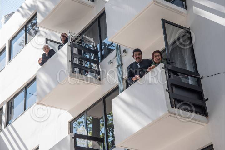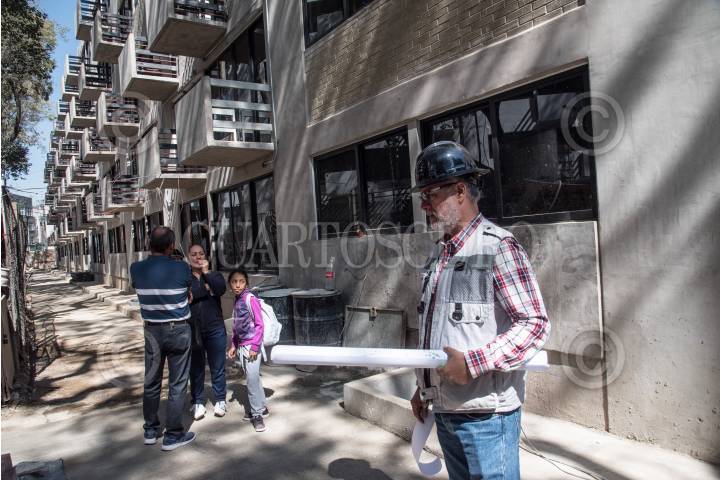 Dos hombres observan a la jefa de Gobierno, desde uno de los edificios recostruidos del Multifamiliar de Tlalpan