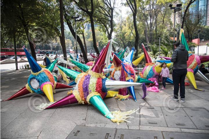 Un conjunto de piñatas gigantes utlizadas en las fiestas decembrinas permanecen a un costado de Paseo de la Reforma.