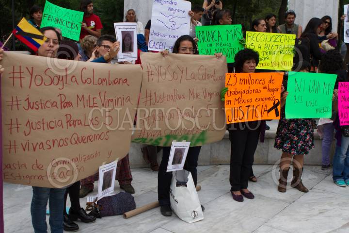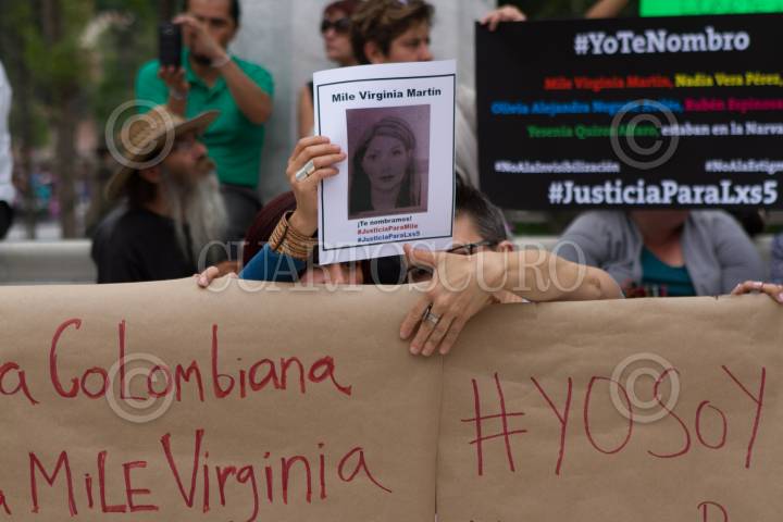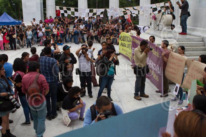 MÉXICO, D.F., 08AGOSTO2015.- La sociedad civil se manifestaron para mostrar su repudió y exigencia de justicia de las víctimas en el asesinato múltiple de la colonia Narvarte, en donde perecieron Rubén Espinosa, fotoperiodista, Nadia Vera, activista y antropóloga, Mile Virginia Martín, joven colombiana y de profesión modelo, Yesenia Quiroz, maquillista de 18 años y Alejandra Negrete, quien trabaja en la casa en el servicio doméstico, asistente al evento lanzaron consignas de justicia y pidieron al gobierno esclarezca este asesinato, el encuentro tuvo lugar en el Hemiciclo a Juárez. FOTO: MOISÉS PABLO /CUARTOSCURO.COM