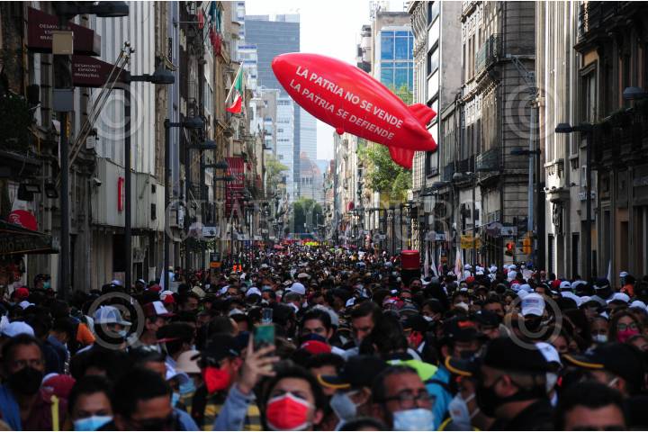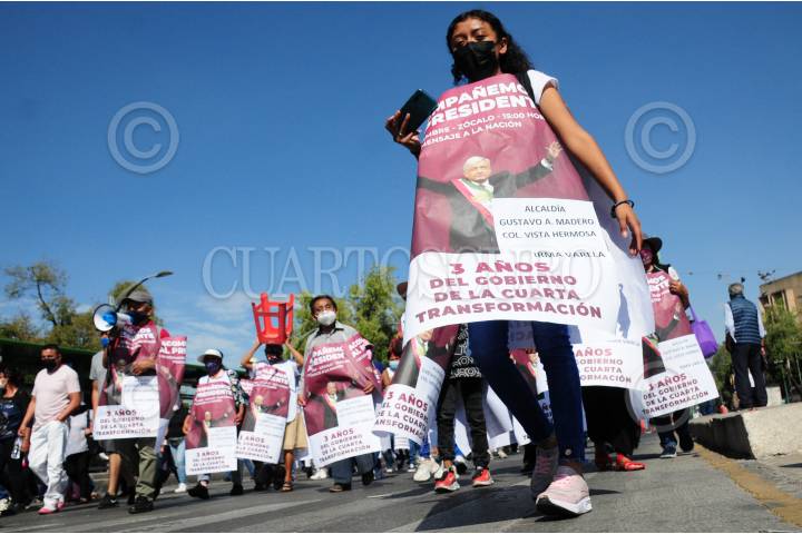 Seguidores de Andrés Manuel López Obrador avanzan rumbo al Zócalo previo al mensaje del presidente.