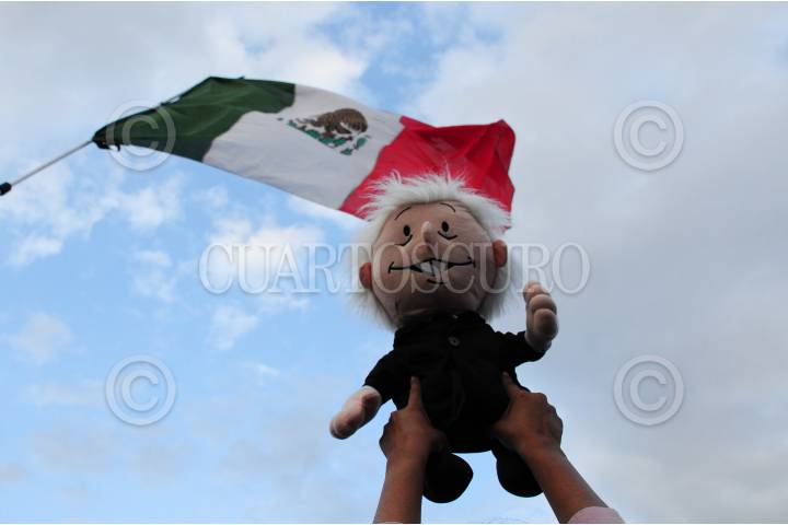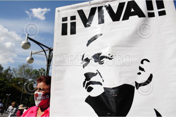 Una mujer lleva un estandarte con el rostro de Andrés Manuel López Obrador.