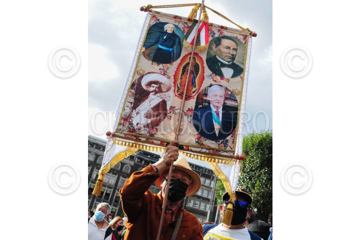 Seguidor de AMLO lleva un estandarte con las figuras de la Virgen de Guadalupe, Benito Juárez, Emiliano Zapata, Miguel Hidalgo y de Andrés Manuel López.