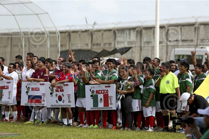 MÉXICO, D.F., 12JUNIO2014.- Con la fiebre del mundial, hoy se inauguró el "Mundialito 2014" en el cereso de Mérida en el cual participan 32 equipos integrados por los reos del penal; con la presentación de la mascota oficial "Cau-tivo" y una replica del Cristo del Corcovado de Brazil los 640 jugadores desfilaron con los uniformes representativos de cada país. FOTO: FRANCISCO BALDERAS /CUARTOSCURO.COM
