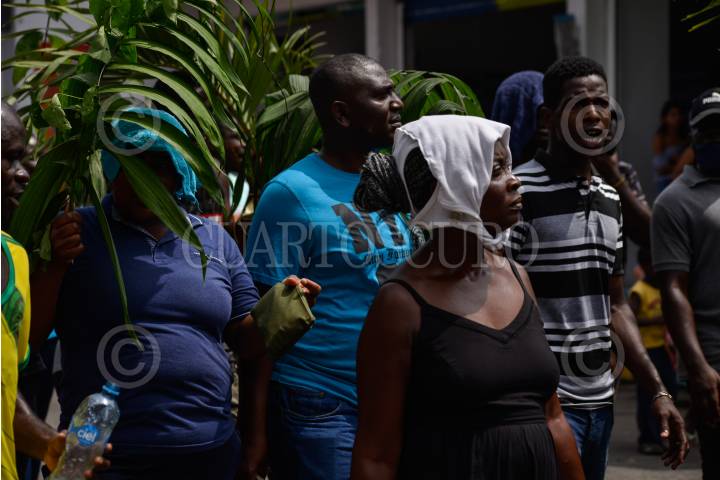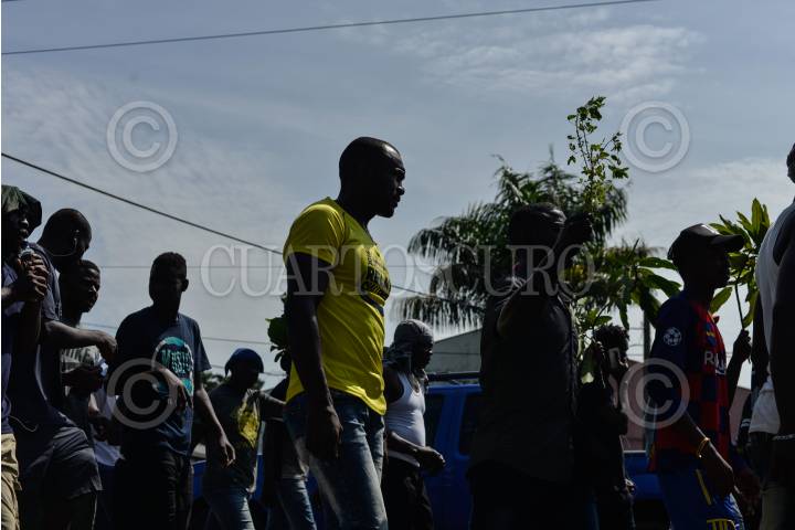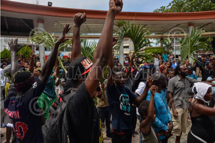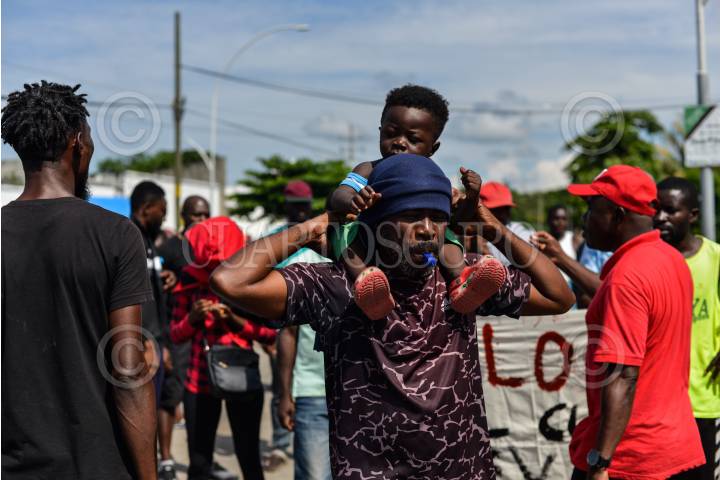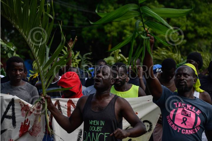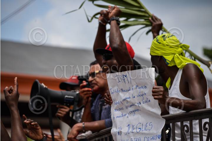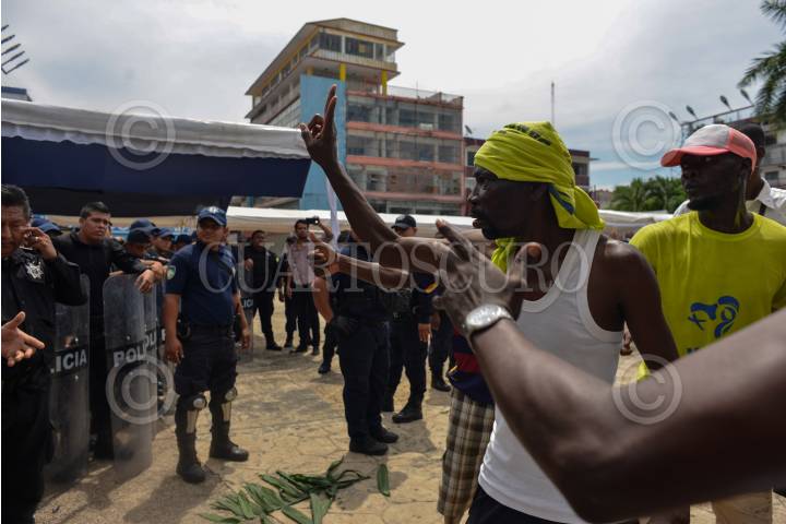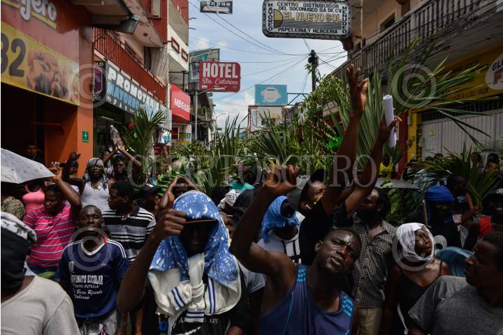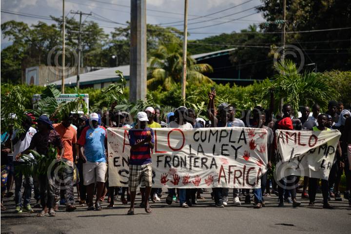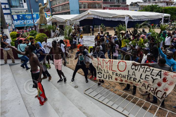 TAPACHULA, CHIAPAS, 04OCTUBRE2019.- Se llevo a cabo la segunda marcha de migrantes africanos, quienes exigen al gobierno la libertad de transitar por territorio mexicano, la mayoría de ellos lleva en el municipio esperando respuestas más de cuatro meses. Al llegar a la presidencia municipal, como lo han hecho en cada una de las marchas que han realizado, se encontraron con un cerco de metal y policías municipales. El contingente de africanos se retiro del lugar y continuaron su marcha hacia el parque bicentenario donde se reunieron con migrantes haitianos, hondureños, salvadoreños y cubanos. FOTO: ISABEL MATEOS /CUARTOSCURO.COM