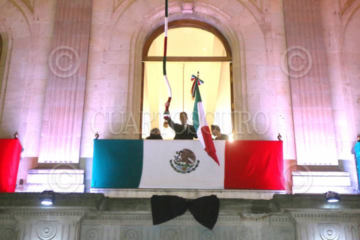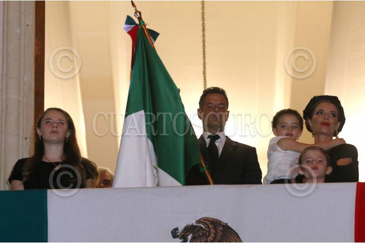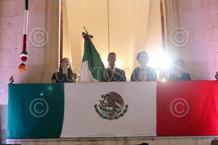 OAXACA, OAXACA,15SEPTIEMBRE2017.- El gobernador del estado, Alejandro Murat Hinojosa encabezó este viernes la celebración por el 207 aniversario del grito de independencia. Con un moño negro colocado debajo del balcón en memoria de las víctimas mortales del sismo ocurrido el 7 de septiembre, Murat Hinojosa aseveró que Oaxaca está de luto, pero de pie. FOTO: ARTURO PÉREZ ALFONSO/ CUARTOSCURO.COM