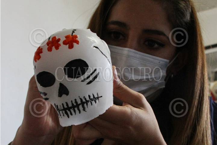 Con aroma a flor de cempasúchil y con figuras de craneo y pan de muerto se alistan veladoras para Día de Muertos.