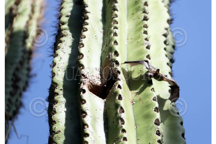 Un murcielago de cara arrugada (Centurio senex) sale de un orificio hecho en la copa de un cactus candelabro en la Reserva de la Biosfera Sierra de Huautla.