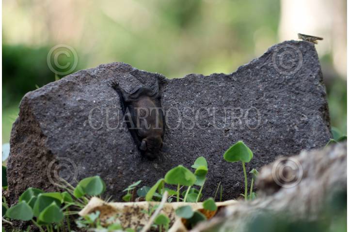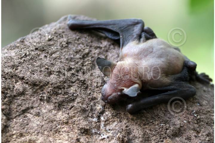 Un murcielago de cara arrugada (Centurio senex) duerme en una roca en la Reserva de la Biosfera Sierra de Huautla.