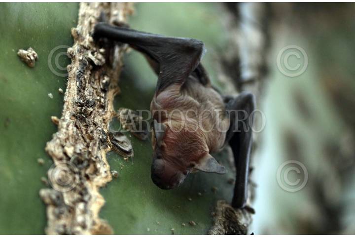 Un murcielago de cara arrugada (Centurio senex) duerme en un cactus candelabro en la Reserva de la Biosfera Sierra de Huautla.